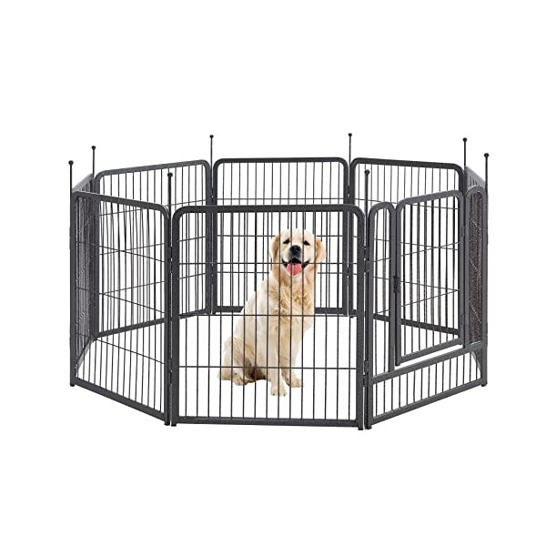 • 🐶Upgraded Pet Playpen: Adopts new type door lock design, much safer and more convenient. Made of heavy duty metal panels and stakes with thick powder coating, non-toxic, anti-rust, and waterproof. Ensures long time use no matter indoor or outdoor. Smooth surface without burrs, the stakes are more easily inserted into the ground for more stability and rigidity.
