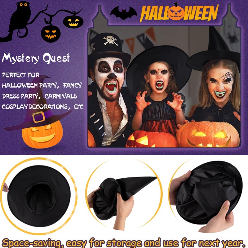 - open it and bounce to a full hat.Take it and storage easily. 3.Witch hat size: 37 cm/ 14. 2"x34cm/ 13.3",one size fits most,portable to carry around.Also a good costume for your kids Trick or Treat activities.
