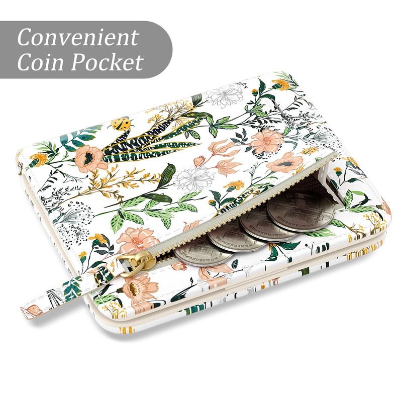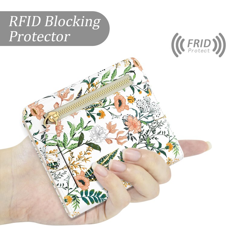 TMOODEL Womens Rfid Blocking Small Compact Bifold Luxury Genuine Leather Pocket Wallet Ladies Mini Purse with ID Window, Elegant White Floral, Small(4.33" x 0.51" x 3.50" ), Floral