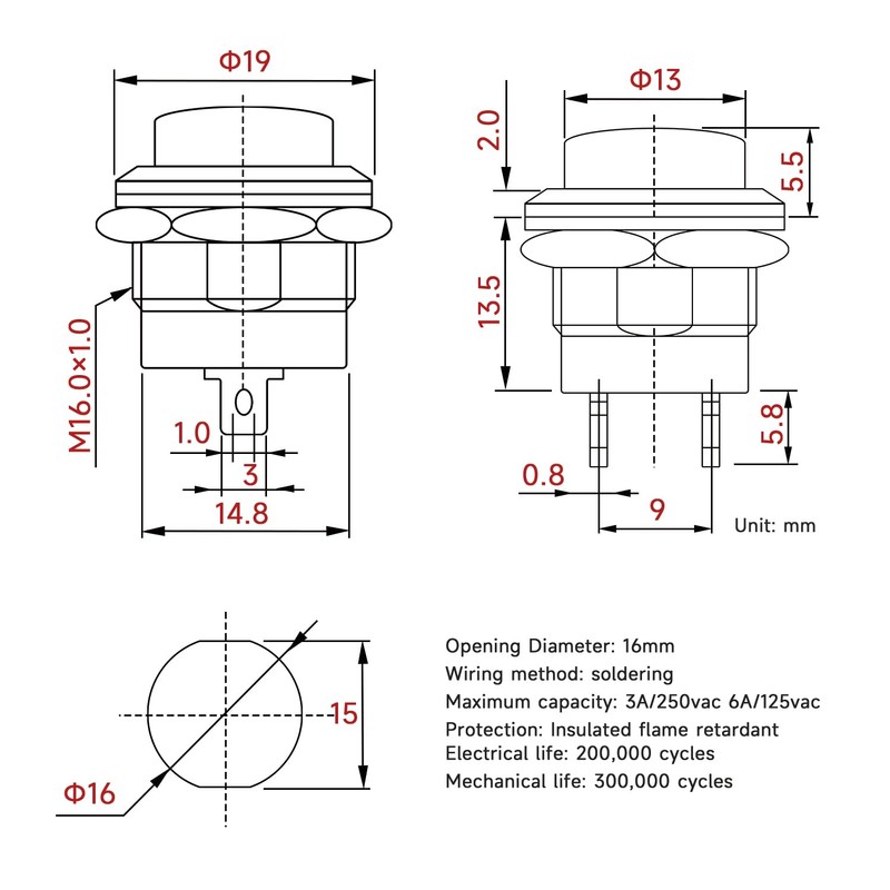 - Push button hole diameter: 15mm/0.59inch, maximum switching capacity 3A/250vac 6A/125vac, distance between two pins 8mm/0.31inch