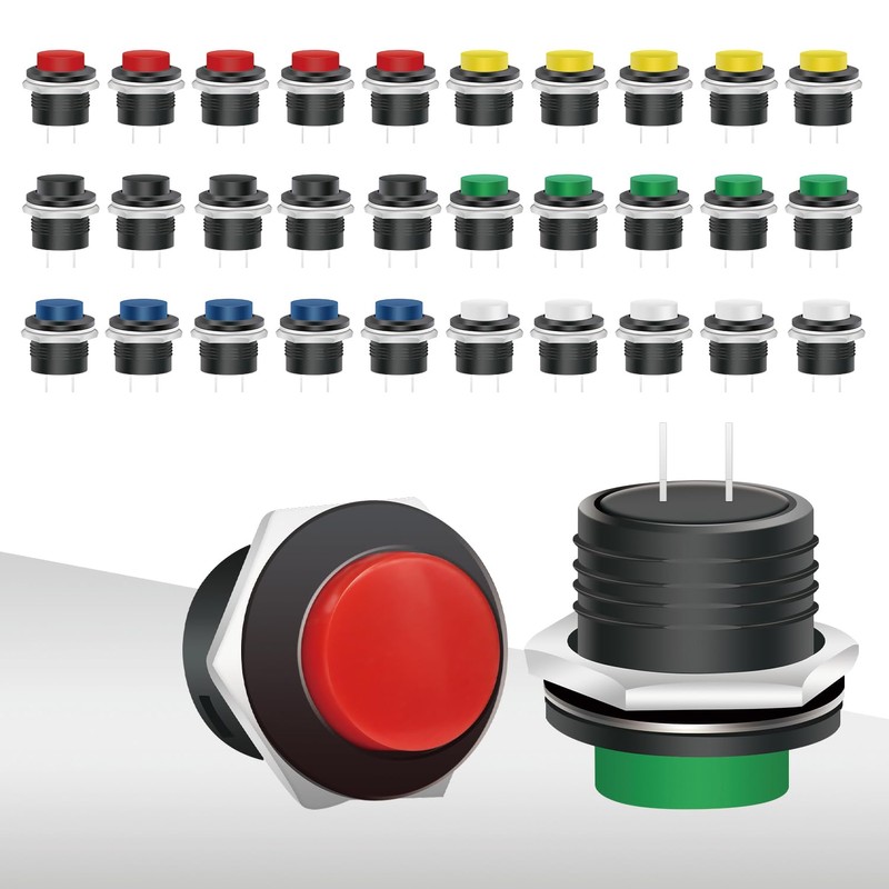 Tmyjfjingxi 30PCS 15mm Momentary Push Button Switch Red Green Blue Yellow Black White Push Button 6A/125V 3A/250V 2-Pin Push Button Switch