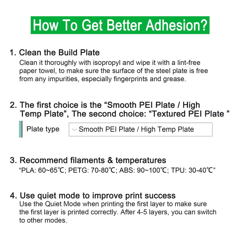 - Built to Withstand High Temperatures: It is resistant up to 200 ℃, ensuring stable printing conditions even for the most demanding prints, compatible with PLA/PETG/PEEK/ABS and other filaments. please use the Quiet Mode when printing the first layer to make sure the first layer is printed correctly. After 4-5 layers, you can switch to other modes.