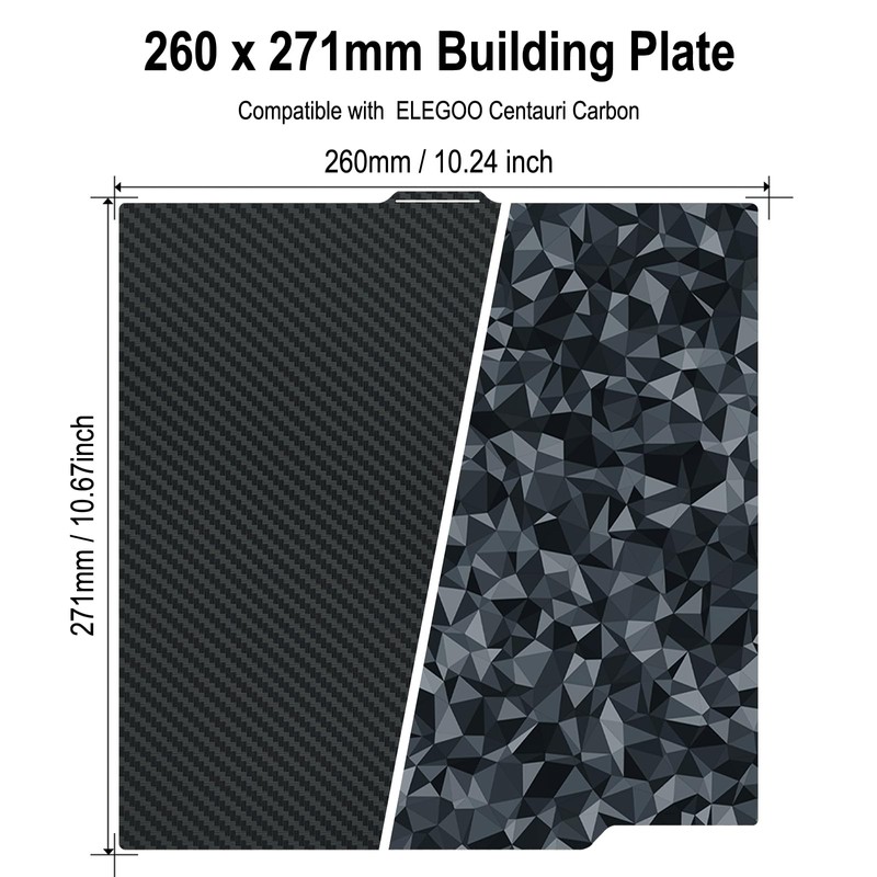 - Compatibility: 260 x 271mm(10.24 x 10.67 inch) spring steel build plate perfect fit for Elegoo Centauri Carbon, and other FDM printers with a platform size of 260x271mm