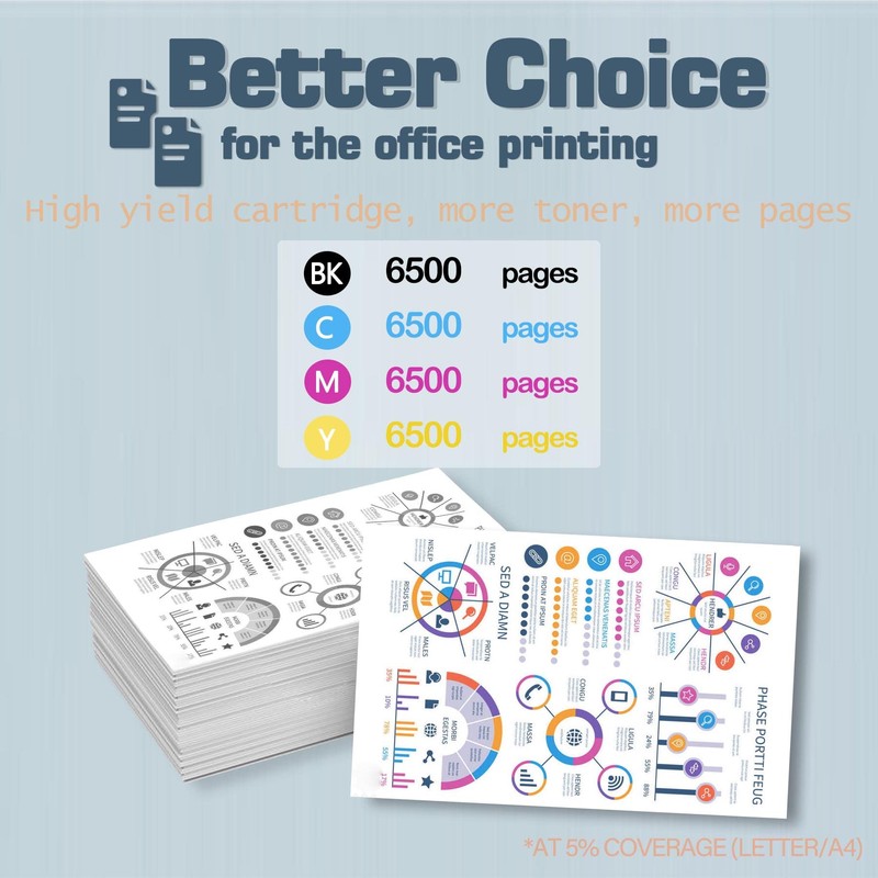 • Estimated Page Yield: Up to 6,500 pages per color Toner(Black Toner Up to 6,500 pages) (at 5% coverage, Letter/A4).