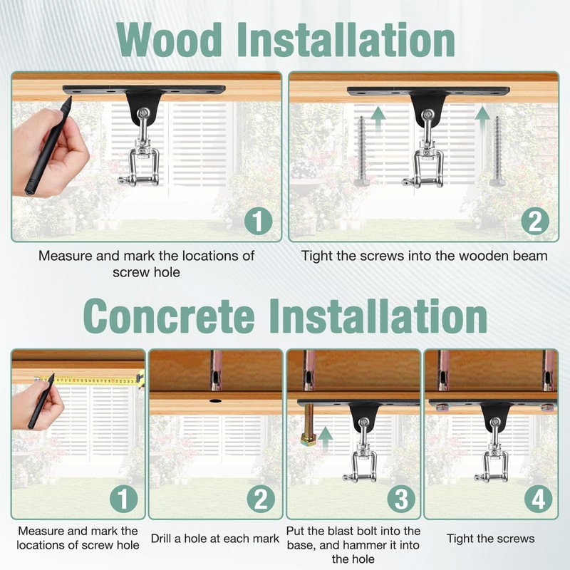 - Easy installation: Say goodbye to complicated installation steps. Our heavy-duty bagged brackets can be easily installed in just 5 steps. Two installation methods are available (including expansion bolts and hex screws), making it easy to install on concrete ceilings or wooden structures, saving you valuable time and energy.