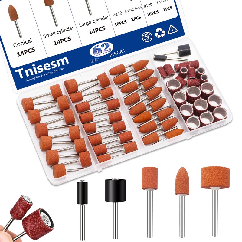 Tnisesm 62Pcs Sanding Bits & Sanding Drum Set for Dremel Rotary Tool with Box, Aluminium Oxide Tough Enough to Metal Rust Removal/Smoothing/Sharpening, Different Shape Meet More Needs