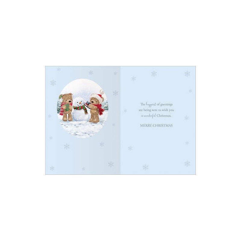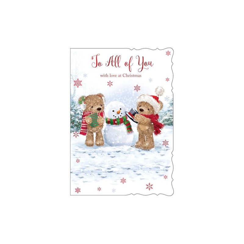 - To All of You Christmas Card - Teddy Bear Couple with Snowman and Snowflakes, Finished with Red Foil