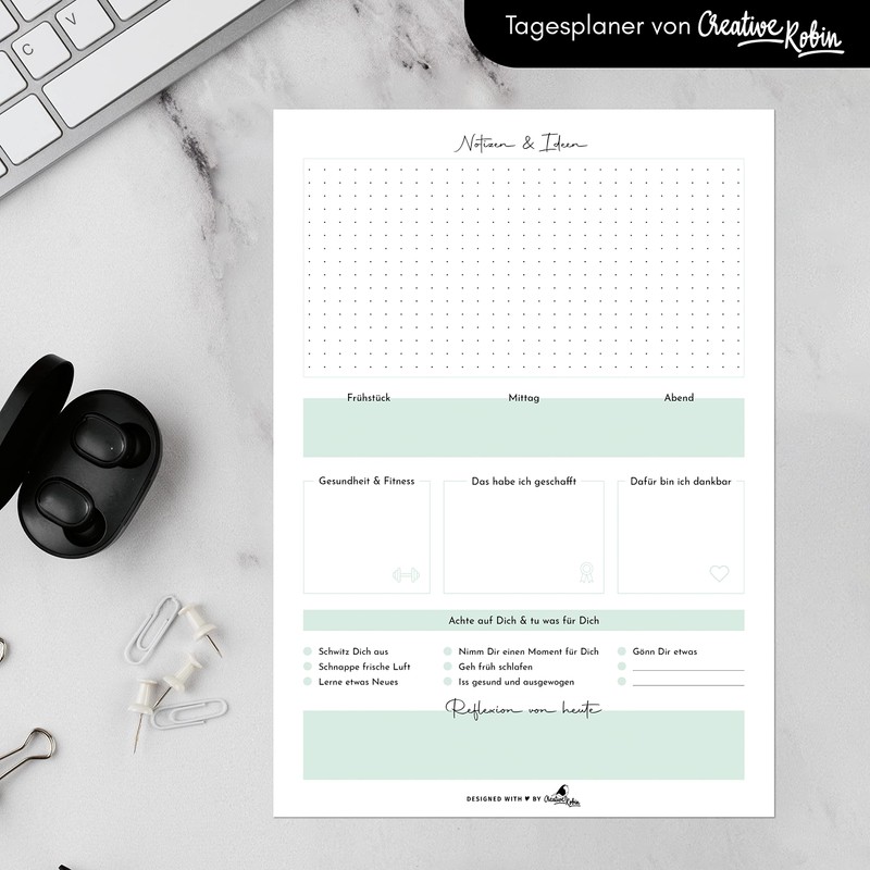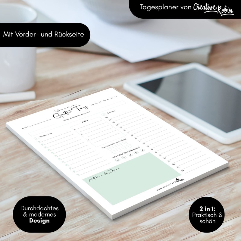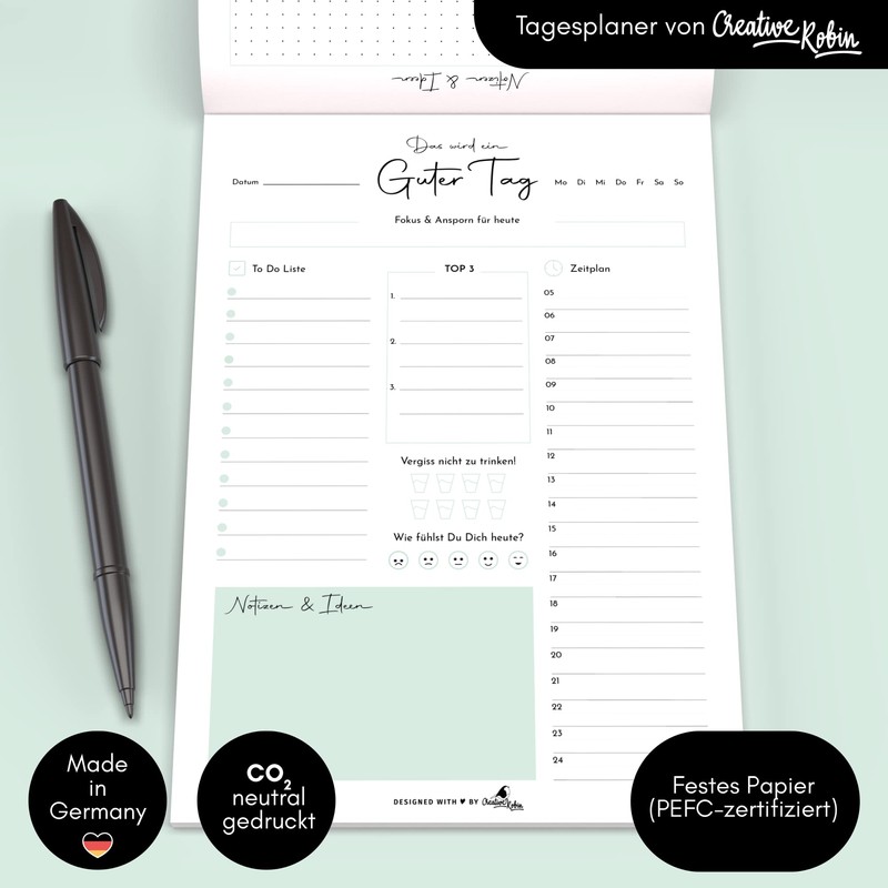 • Printed on both sides: with the front you plan your day and on the back you can record all your notes and ideas; clearly arranged so that you always have a clear view.