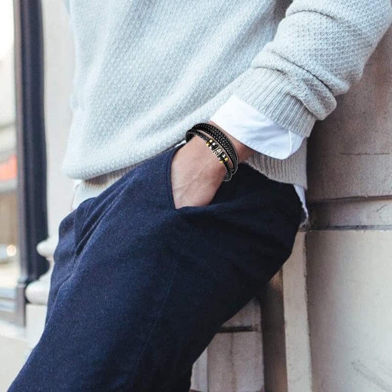 - LEATHER BRACELETS FOR MEN:This bracelet is hand-woven and consists of 3 layers of bracelets, the design is simple and textured, perfect for your own son to wear.