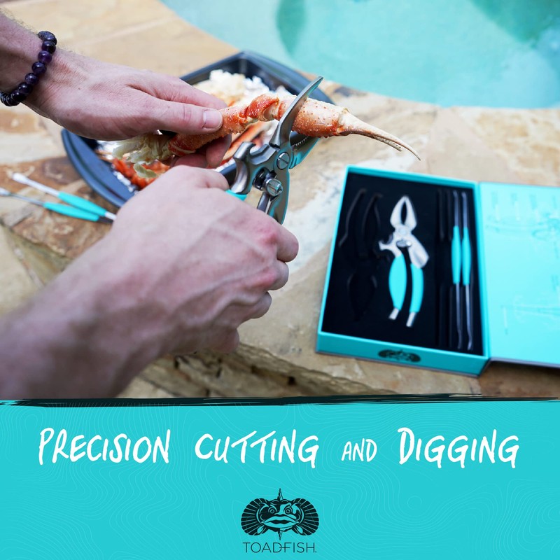 - For True Seafood Lovers: Get the beach feast started with your new Toadfish Crab & Lobster Seafood Tool Set—complete with (2) substantial stainless steel shell crackers/cutters and (4) multi-purpose forks all neatly presented in a signature blue Toadfish package. Exquisite in form and function, these tools perfectly cut crustacean shells then smoothly scoop out delicacies. A household must-have & an incredible gift for fellow seafood fans.