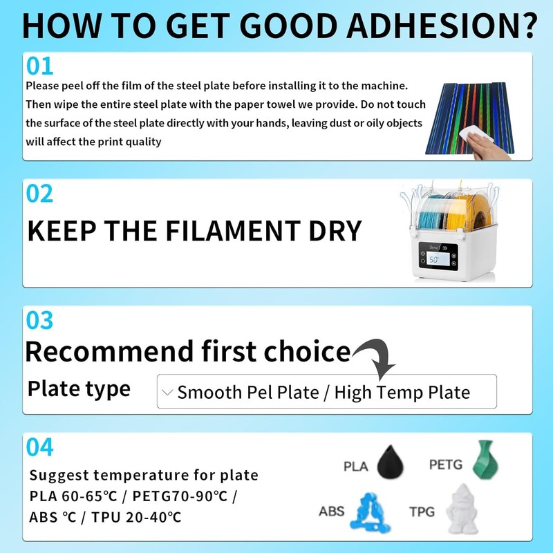 - Easy Print Bed Adhesion: The model can be firmly attached to the surface of the print bed. Easily print even for a newbie. The H1H spring steel flexible build plate (253.8 x 241 mm) has a good adhesive,even better than smooth PEI PET or PEO. It even can stick well without heating the platform, no glue needed. Please let the build plate cool down(Below 30 degrees Celsius) before remove the model to protecting the coating.