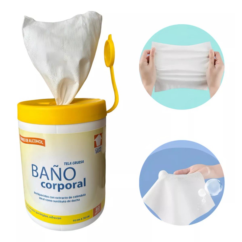 - Bote jumbo con 80 toallas húmedas desechables para baño corporal de pacientes en cama como sustituto de ducha.
