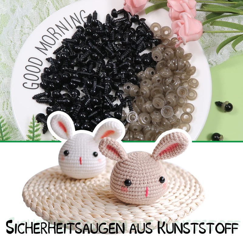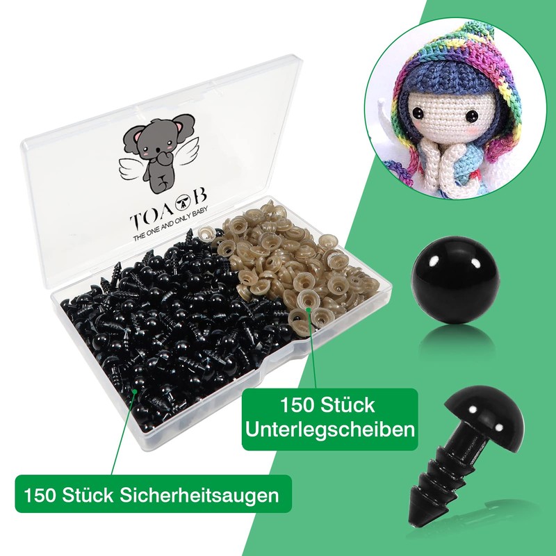 Toaob Pack of 150 Safety Eyes, 8 mm, Black, Plastic, Crafts, Dolls, Eyes, Button Eyes with Washers for Crochet Animals, Doll, Puppet, Plush Toy, Teddy Eyes