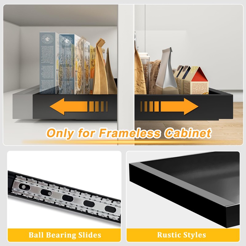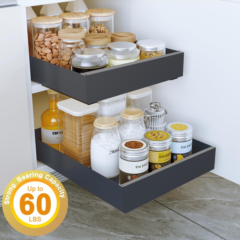 - 【Solid Metal Panel】Each heavy duty sliding shelf is designed to enhance weight capacity and stability, ensuring a better experience. The solid metal panel strengthens the overall structure, makes cleaning easier, and prevents debris from falling through gaps. You'll never have to dismantle your pull out shelves just to clean the bottom of your cabinet again.