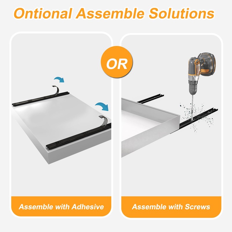 - 【Peel and Stick Adhesive】Comes with adhesive nano tape, installing this pull out shlef is a breeze and won't damage your cabinets. If you prefer a more secure setup, screws are also included for your convenience. You have the flexibility to choose between these two installation methods.