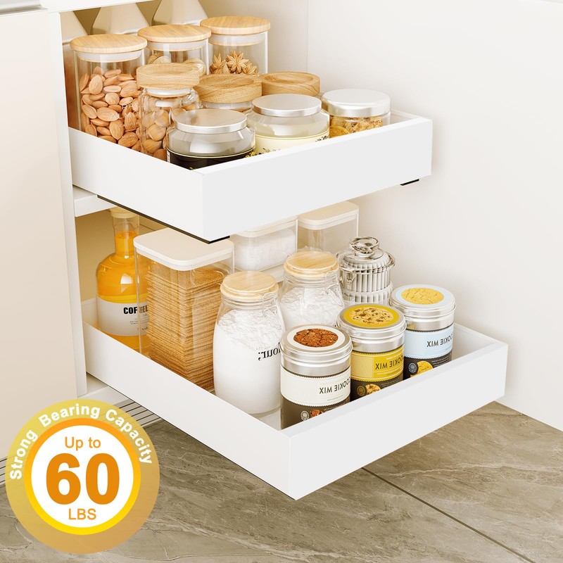 - 【Solid Metal Panel】Each heavy duty sliding shelf is designed to enhance weight capacity and stability, ensuring a better experience. The solid metal panel strengthens the overall structure, makes cleaning easier, and prevents debris from falling through gaps. You'll never have to dismantle your pull out shelves just to clean the bottom of your cabinet again.
