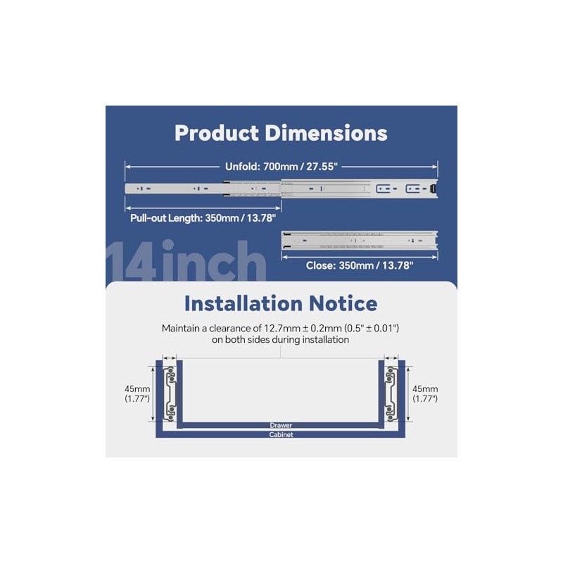 - 【Double Anti-Rust】The drawer slides feature a blue zinc plating finish that provides excellent corrosion resistance by creating a protective barrier against moisture and oxidation. This high-quality surface treatment not only extends the life of the slides but also ensures their durability in various environments. We focus on the quality of our slides, ensuring that the product you purchase will serve you well for years to come.