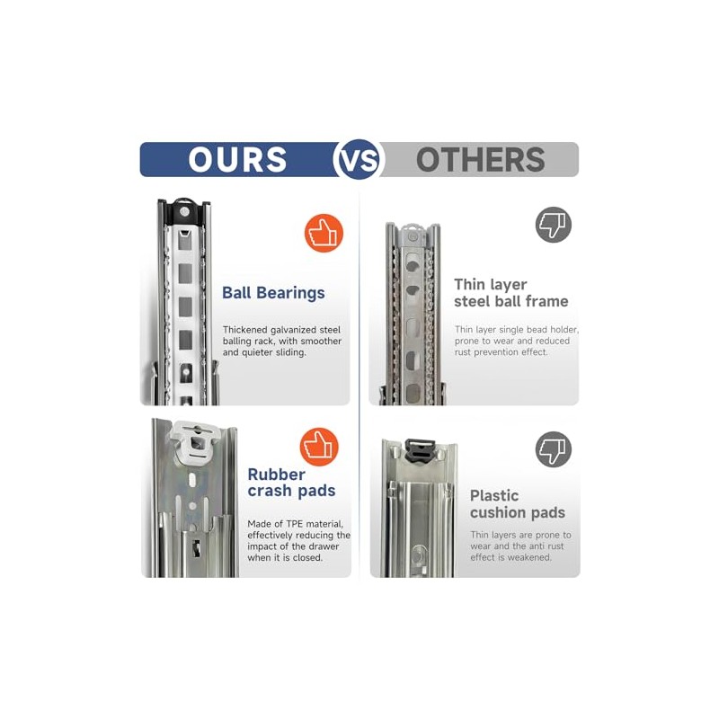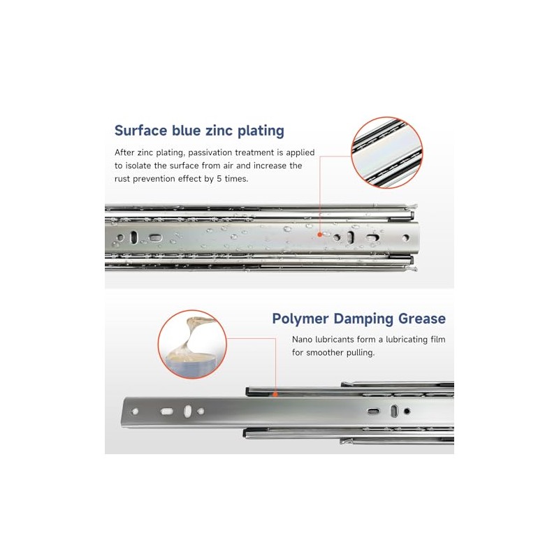 - 【Max Load Capacity 150lb】 Slide with blue zinc plated surface treatment, industrial grade steel ball frame, maximum load capacity up to 150lb.It can support heavy load storage without deformation, and the bottom is equipped with a limited rubber pad, which is made of ABS plastic, with good wear resistance and good impact resistance. After testing, the number of opening and closing times has reached more than 150,000 times.