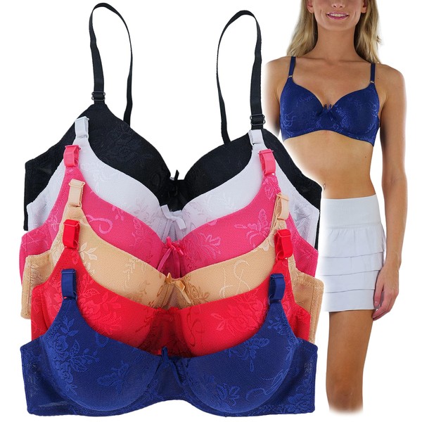 ToBeInStyle - Pack de 6 sujetadores acolchados con detalle de encaje frontal para mujer, Floral suave y mariposa - 38c, 38C