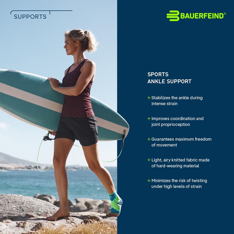 - ✅ AYUDA A PROTEGER CONTRA ESGUINCES: La tobillera de Bauerfeind mantiene el tobillo en su lugar durante las actividades deportivas más largas y reduce el riesgo de esguinces y lesiones en el tobillo. La compresión favorable del soporte y la cinta de fijación integrada (taping) estabilizan el tobillo. Las cintas cruzadas brindan soporte ajustable y flexibilidad para asegurar una estabilización efectiva y un ajuste cómodo