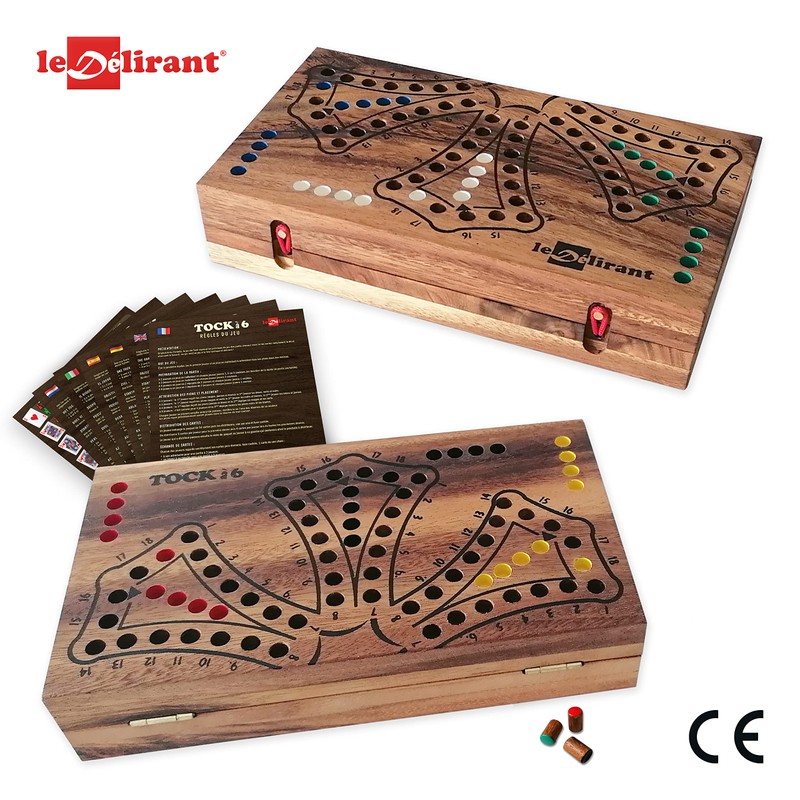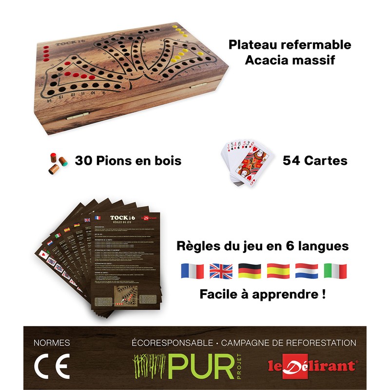 TOC 6 BOARD GAME - TOCK in colour. From 2 to 6 players from 7 yo, family strategy board game in eco-friendly solid wood - CE standards. Brand : le Délirant®, easy to store with reclosable board.