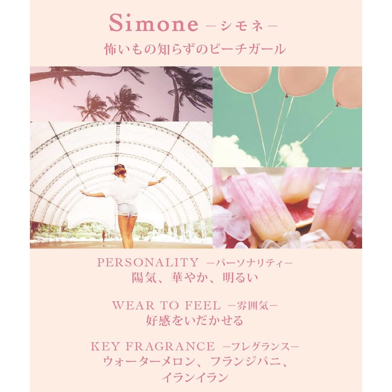 - Simone Scent: A floral scent that overlaps the refreshing sweetness of water melon with the flangepani