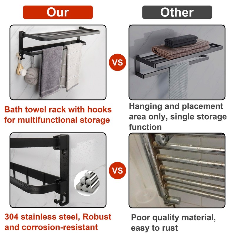 • PREMIUM MATERIAL: Towel Storage organizer is made of premium material, rust-resistant in wet places, such as bathroom, shower, kitchen, etc. Heavy duty construction sturdy enough for long service life. Thick premium black finished resist scratches from daily use and ensure it is as good as new.