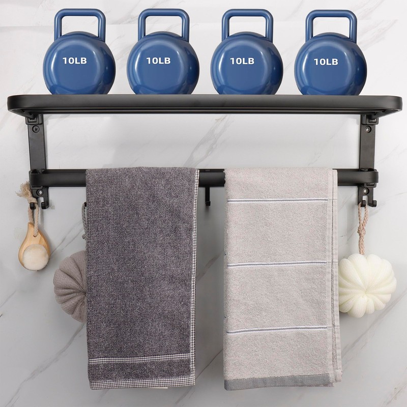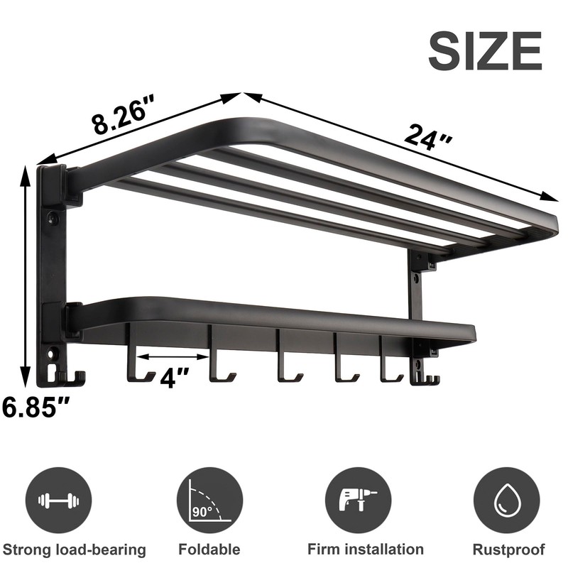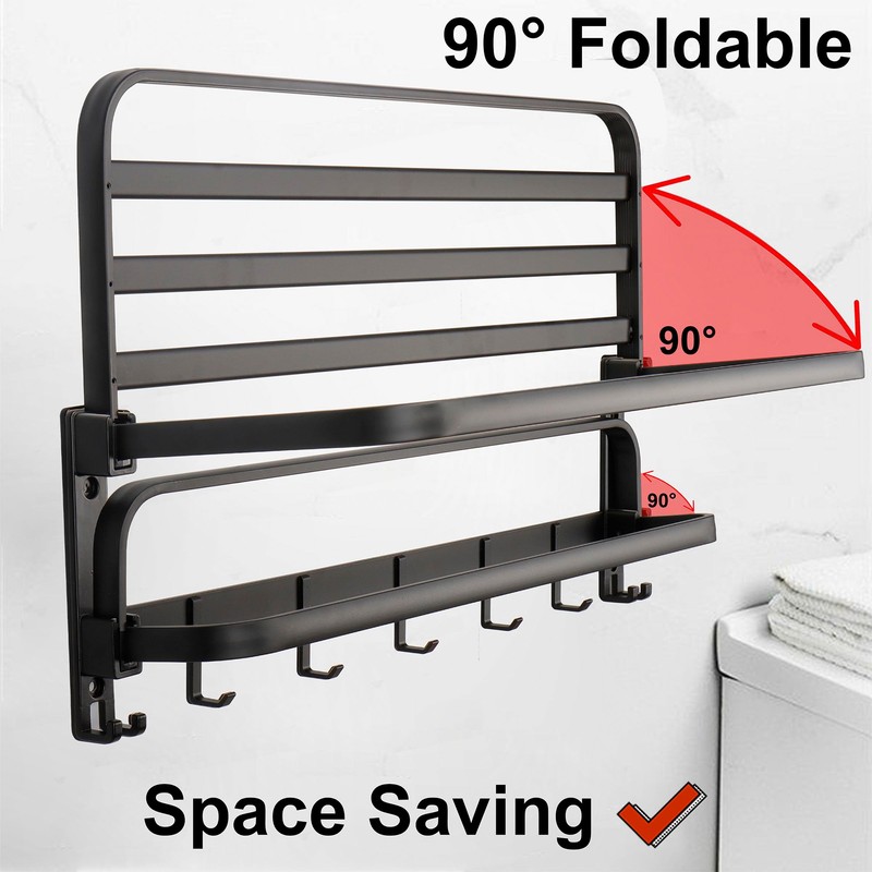 • SPACE SAVING: Stylish and versatile towel shelf can be folded against the wall to save space. You can fold it up when you don't need to use it. Moreover, bath towel holder comes with 7 sturdy hooks for hanging bath towels, robes , clothes, kitchen utensils and bags. Make your life more organized and convenient, perfect for bathroom, toilet, kitchen, bedroom, balcony, cloakroom, laundry room and drying room etc.