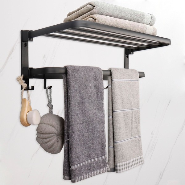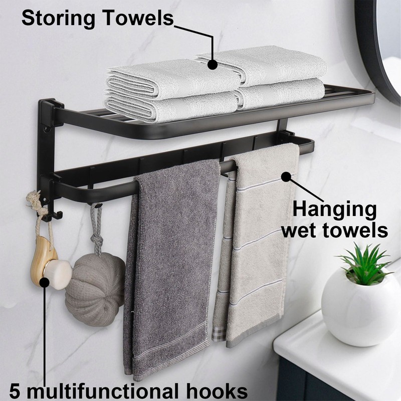 TocTen Towel Rack for Bathroom, Foldable Towel Holder with Double Towel Bars and 7 Hooks, SUS304 Stainless Steel Wall Mounted Bathroom Tower Shelf, Towel Hanger for Bathroom, Lavatory (Black,24 in)