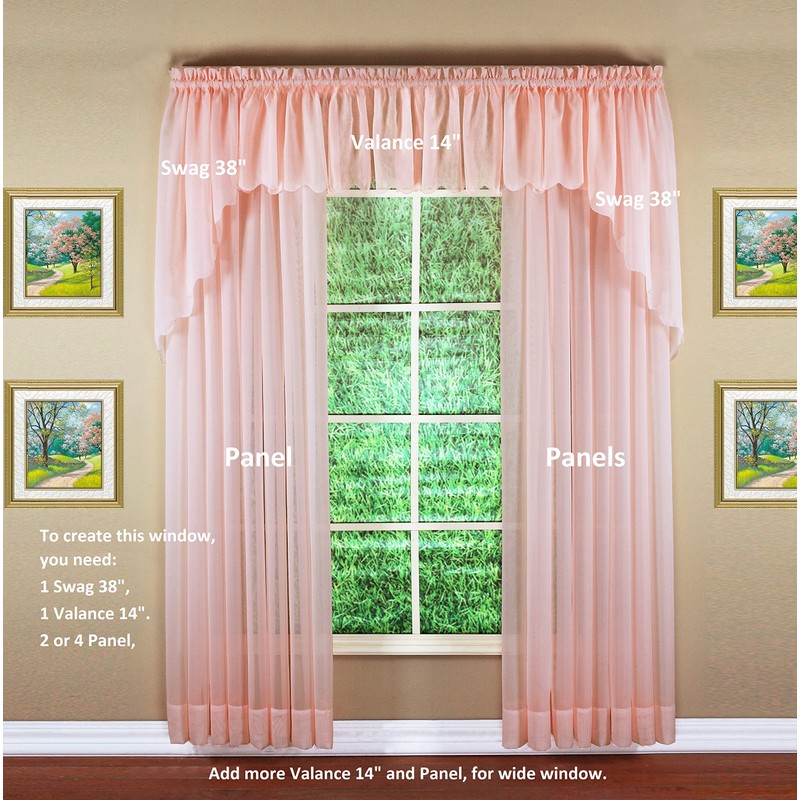 - engineered with scalloped sides and edges on valance 14"; for top treatment, or use valance 14" as insert with swag 38" or swagger 63" for toppers, add more units for wide windows.