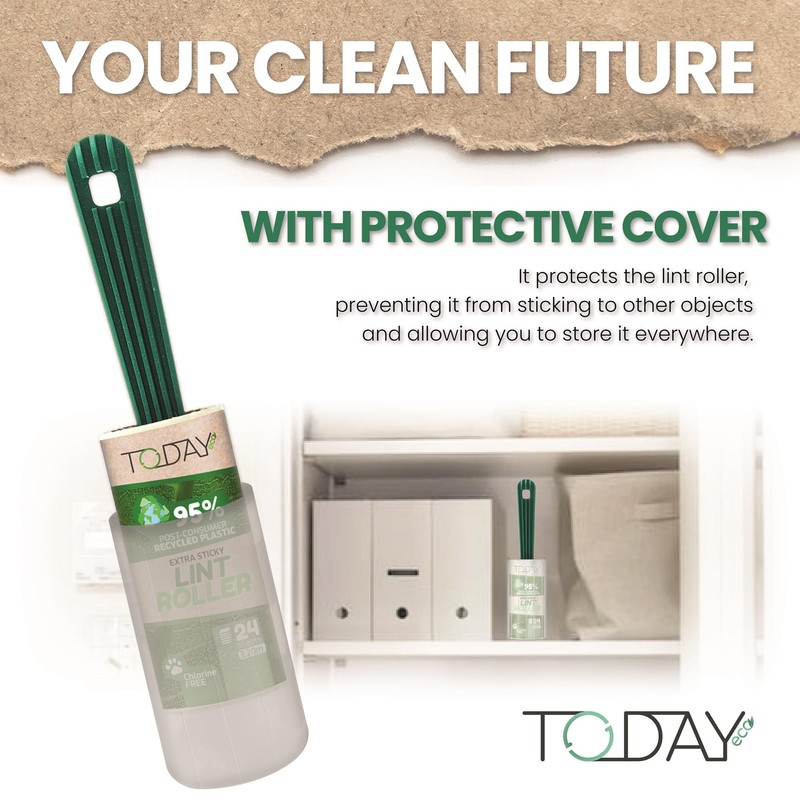 Today Today Eco - Lint Rollers 95% Recycled 4 Rolls + Handle + Cover. Post-consume plastic lint remover for cat and dog hair, extra sticky pet hair Remover, 24 sheets