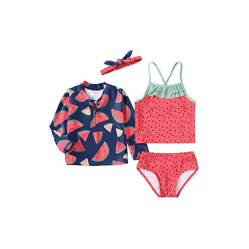 - 【Design】- 4-piece set design, The top can be worn with only the bikini inside, or the long sleeve rush guard outside, or both you can wear, which is very practical.Long sleeve rush guard,sun protect fabric, in summer, can effectively protect the baby's skin.Front zipper design,easy to put on and take off.Spaghetti strap bikini,double layer ruffle on neckline,very cute.Bikini bottom, simple and stylish.Matched headband is included,make your baby more charming.