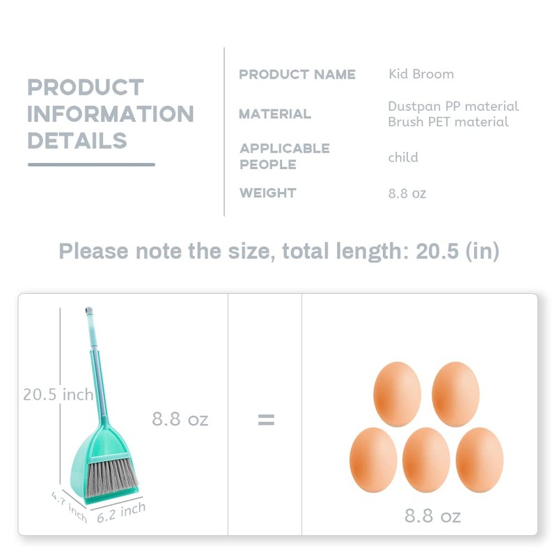 - Compact Size: The mini kids broom:20.5 x 5.9in and the dustpan: 15.5 x 6.2 x 4.7in. Kids broom and dustpan set is a great tool for early education in cleaning skills. (Please note that the size is small and it is primarily intended for children's pretend play and initial training.)