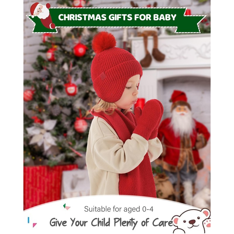 Toddler Kids Winter Hats Mittens Gloves Scarf Warm Ear Flaps Baby Beanie for 0-6 12 Months 1 2 3 4 Year Old Girls Boys Gifts