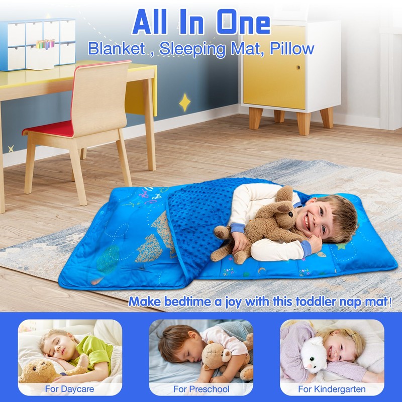 - 【Child-Friendly Nap Mat】Our Bella’s Friends 51”*20”Toddler nap mat with one-piece design includes an attached pillow, quilted nap mat and 39”* 30”blanket . Whether it's nap time at daycare, preschool, kindergarten, at home, or even outdoors, this kids' nap mat with its cute print ensures that your little one has the ultimate bedding for sweet dreams
