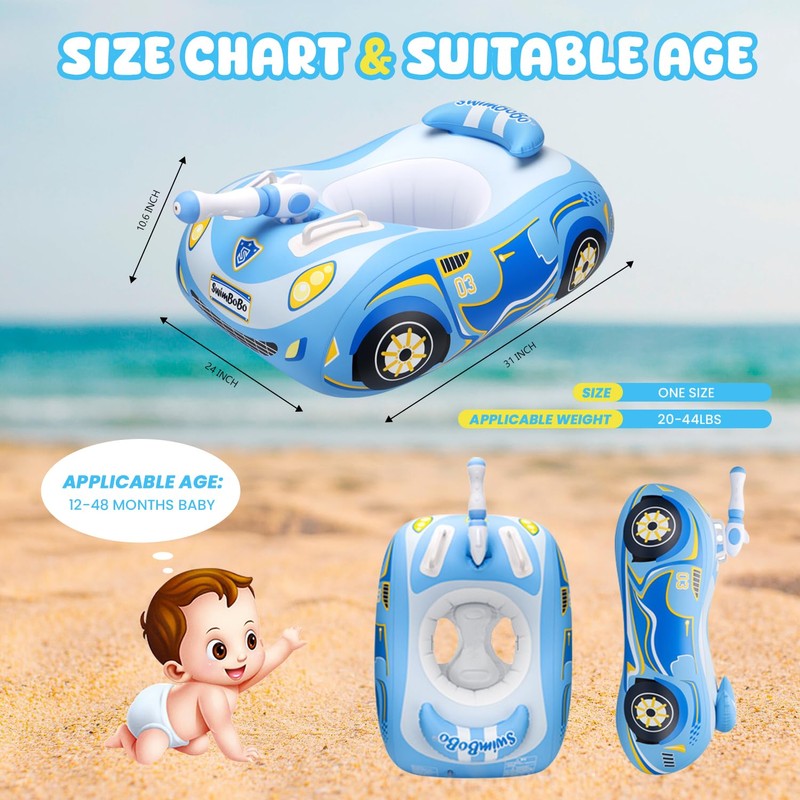 - Baby Swim Float Car Design - The floaties for toddlers is shaped like a cute car, complete with a steering wheel to keep your child engaged and entertained.Playful 3D car design and "BEBE" sounding horn will give a lot of fun for your baby in the swimming pool