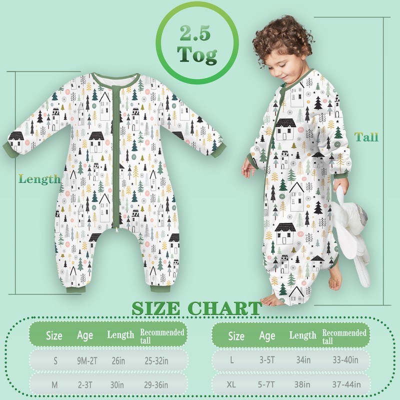 - MULTIPLE SIZES: We offer 4 sizes of baby wearable blanket for kids from 9 months to 7 years old, which are 9-2T, 2T-3T,3T-5T,5T-7T.We have indicated the size of each size of the sleeping bag in the picture, and we also recommend the corresponding height for the kids. Please measure your child's height from ankle to shoulder to choose the most suitable sleep sack with legs size for your baby.