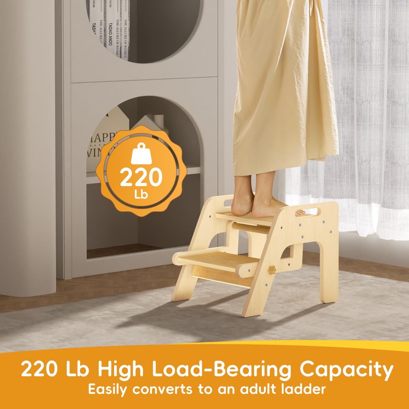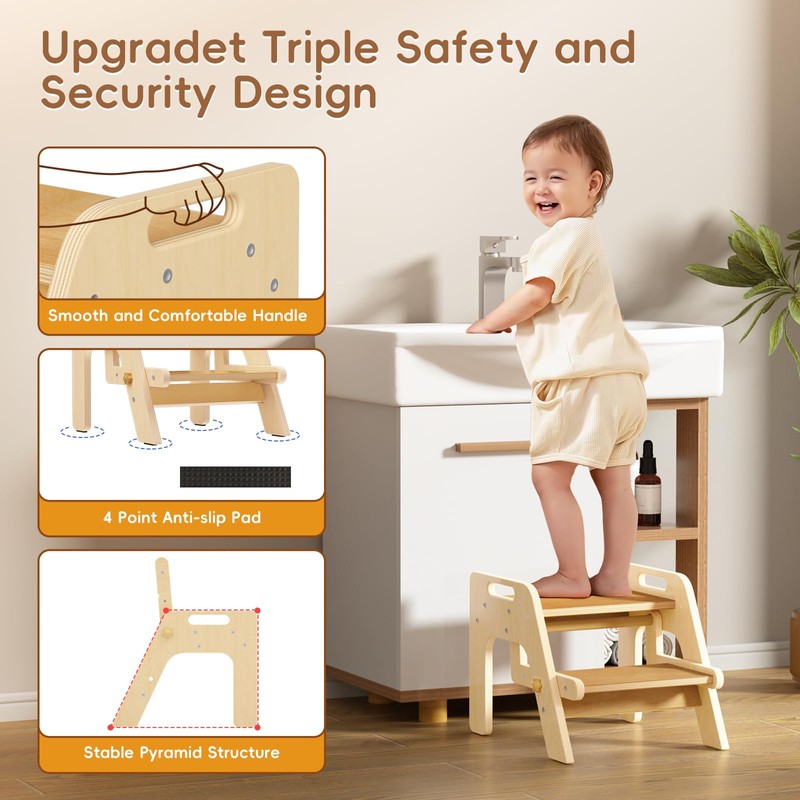 - [UPGRADED QUADRUPLE SAFETY AND SECURITY DESIGN] The safety of baby is our top priority. The Bilateral anti tipping feet and stable pyramid structure ensures maximum stability of the kids step stool, the ergonomic smooth, comfortable handle completely alleviates baby's fear of falling or climbing, 0.6 inch thicken multi-layer birch wood board can bear up to 220 pounds, and the smooth polishing process ensures that the baby step stool has no burrs, caring for the delicate skin of baby.