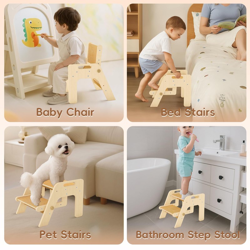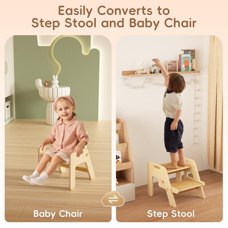- [PIONEERING 2-IN-1 CONVERTIBLE DESIGN] Our upgrade toddler step stool transforms between toddler stool& baby chair within seconds, suitable for the needs of babies aged 0-6 at different stages, suitable for various use scenarios such as home, kitchen, travel, and outdoor activities! Accompanying your little one every step of the way.