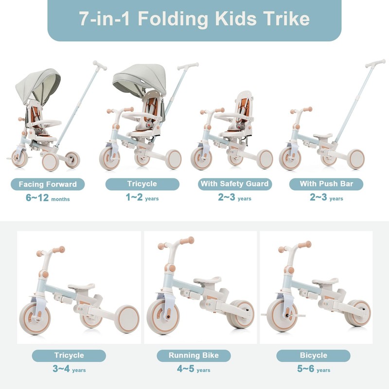 - 👶【7 in 1 Toddler Tricycle】: This versatile toddler tricycle is designed to meet the needs of children from 12 months to 6 years old. With 7 different modes, including a toddler trike, steering trike, learn-to-ride trike, classic trike, balance bike, and fold mode, it grows with your child by simply removing or adjusting accessories.