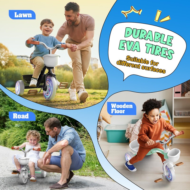 - 【Colorful Lighting Design】: Light up the night, double the fun for your kids! No batteries required, simply spin the wheels to glow. These dazzling lights add an extra layer of excitement to every ride, also improve visibility and increase safety of night rides. Our toddler tricycle is the ideal toys for ages 2-4 kids.