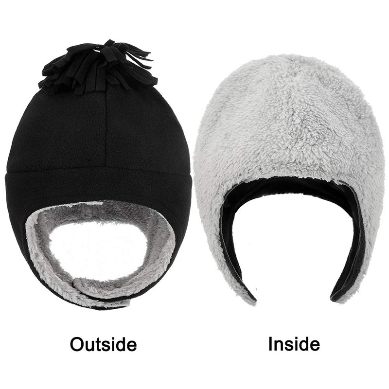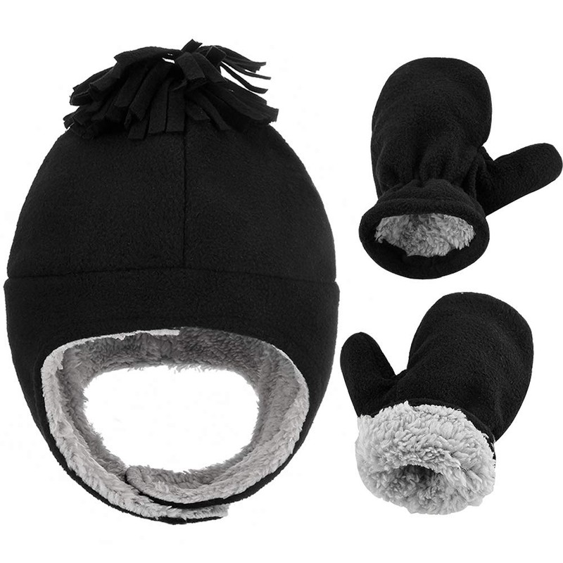 Toddler Winter Hat with Mitten Set - Baby Kids Sherpa Lined Warm Fleece Cap Set with Ear Flaps (Black, L)