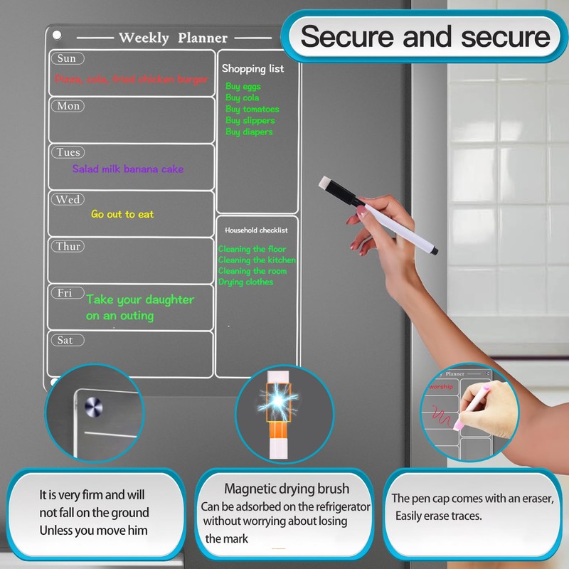 • Size and material: this acrylic magnetic dry erase board size is 9X13IN, and the writing is highly clear. It is made of high-quality acrylic material, solid, bright, and easy to clean. -Note:acrylic dry erase board for refrigerator Do not wipe with alcohol or organic cleaner "". Clean thoroughly with water or wet towel