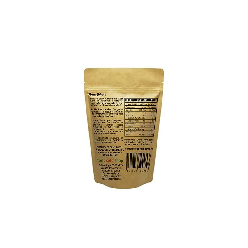 - EMPAQUE ECOLÓGICO | Comprometidos con el bienestar del planeta, nuestra Leche Condensada Keto viene en un empaque ecológico, diseñado para minimizar el impacto ambiental sin comprometer la calidad y frescura del producto.