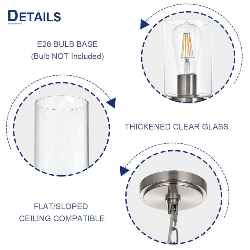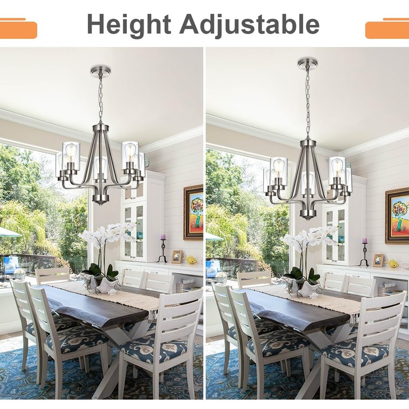 - UNIQUE DESIGN - With the unique designed in metal frame and clear glass cylindric lampshades, this chandelier can give you a flattering illumination.