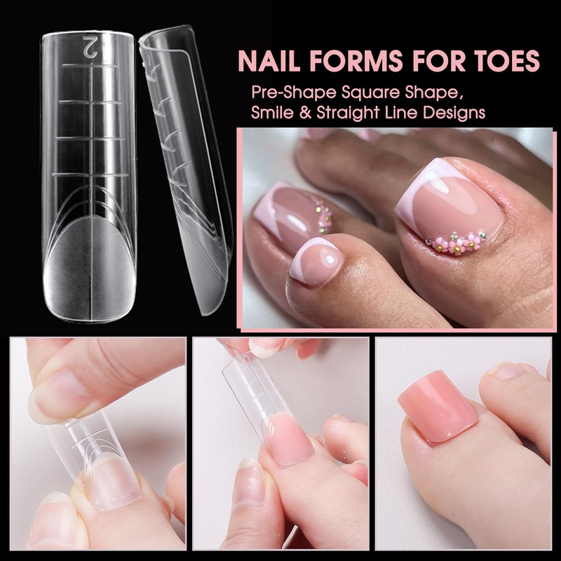- Toe Nail Dual Forms with 12 Sizes: 120 reusable square double nail shapes in 12 different sizes for polygel toe nail extenders, French tips and acrylic toe nail designs, each nail mold is engraved with a number from 0-11 to represent different lengths and widths, so you can quickly find the right size.