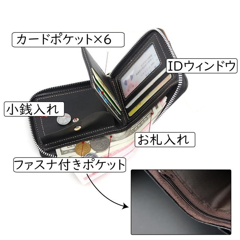 - Storage Capacity: Bill compartment x 1, card pockets x 6, coin purse (zipper) x 1