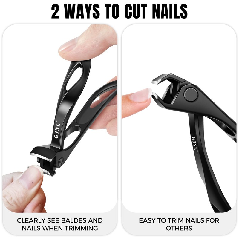 - GREAT VALUE SET - GJNL nail clippers set includes a large opening nail clippers for thick nails, an angled head toenail clipper for seniors, a stainless steel nail file, a double-ended ear pick, packed in a beautiful carton. One set for every nail type, including men's, women's, seniors' and even pet's nails. Get a salon-like pedicure experience at home with just this set.