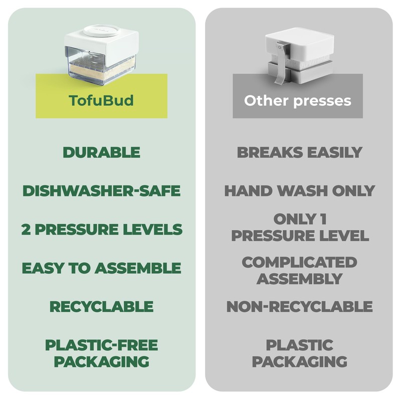 TofuBud Tofu Press - Presser for Firm or Extra Firm Tofu - Dishwasher Safe with Water Drainer - Made from Durable Sustainable Materials - Perfect for Vegan Cooking - Healthy Recipes Cookbook Included