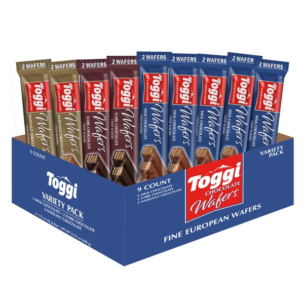 TOGGI Fine European Chocolate Wafers, Variety Snack Box, Milk Chocolate, Dark Chocolate, and Hazelnut (1.75 oz 9 Count)